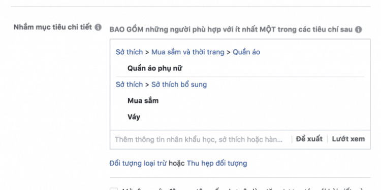 Trong khi đó, sở thích (interest) bao gồm các hoạt động, trang, và nội dung mà người dùng đã tương tác trên Facebook. Việc thêm sở thích trên Facebook (interest targeting) cung cấp cái nhìn sâu hơn về thói quen và hành vi của người dùng, giúp nhà quảng cáo tạo ra những chiến dịch phù hợp với sở thích và nhu cầu cụ thể của họ.