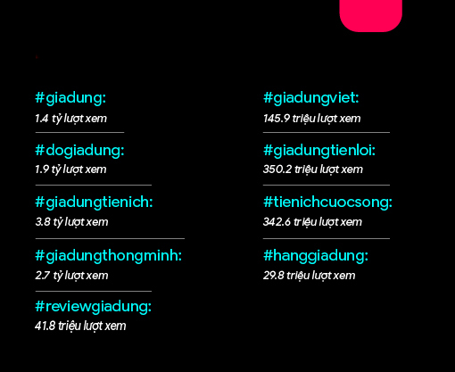 Đồ gia dụng hiện đại ngày càng được trang bị nhiều tính năng tiện ích, giúp tiết kiệm thời gian, công sức và mang lại trải nghiệm sử dụng tốt hơn cho người dùng. Điều này khiến nhiều người có xu hướng mua sắm đồ gia dụng để cải thiện chất lượng cuộc sống của mình. Không chỉ vậy, ngành đồ gia dụng có một số lượng lớn hashtag nổi bật với lượng người xem khá cao.
