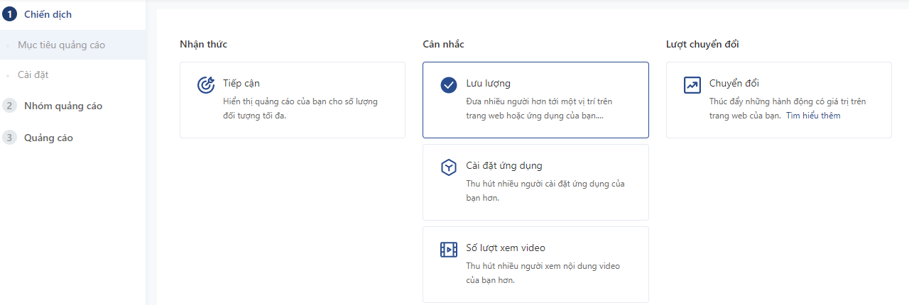 Trong khoảng thời gian này, mục tiêu của chiến dịch quảng cáo bạn nên cân nhắc lựa chọn là “Cân nhắc”, “Tìm kiếm khách hàng tiềm năng” và “Lượt chuyển đổi trên trang web” . Bạn có thể kết hợp những loại hình quảng cáo dưới đây để đạt được mục tiêu của giai đoạn 2: