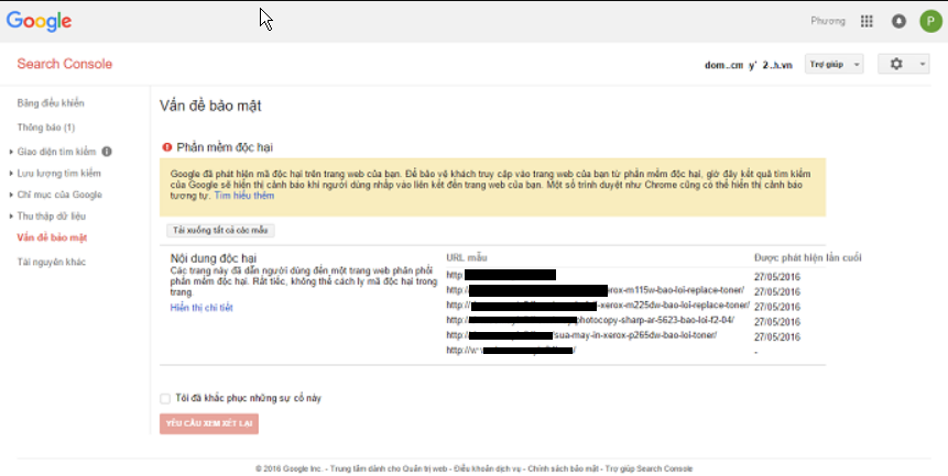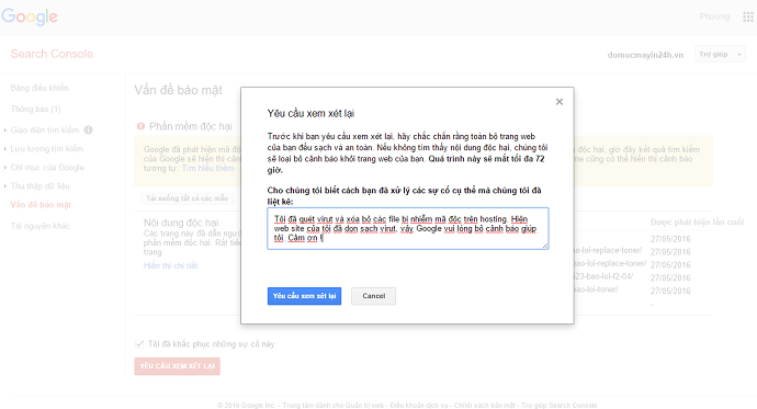 Bước 2: Khi bạn đã hoàn thành bước 1, bạn cần thực hiện gửi yêu cầu để Google gỡ bỏ cảnh báo trên trang web của bạn bằng cách truy nhập Google Webmaster
