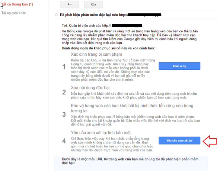 Lúc đó bạn cần thực hiện lại bước 1, rà soát lại trong code web và loại bỏ hoàn toàn các mã độc. Các script nguy hại và thực hiện gửi lại yêu cầu đề nghị Google gỡ bỏ cảnh báo.