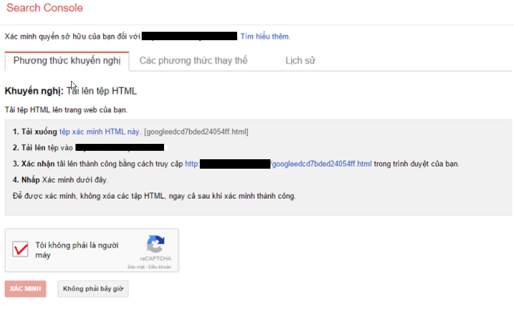 Sau đó xác minh quyền sở hữu tên miền với google bằng cách: