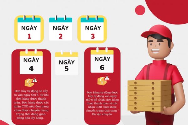 Ví dụ: Ngày 1: Khách hàng đặt đơn hàng => Ngày 2: Người bán chưa đóng gói và chuẩn bị hàng hóa => Ngày 3: Người bán vẫn chưa đóng gói và chuẩn bị hàng hóa => Ngày 4: Hệ thống tự động hủy đơn hàng vì trạng thái đơn hàng không chuyển sang “Cần vận chuyển – Chờ lấy hàng” sau 4 ngày kể từ khi tạo đơn.