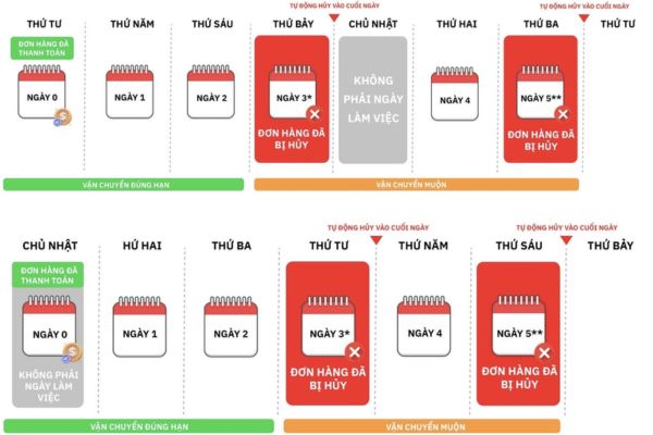 Đơn hàng sẽ tự động hủy nếu không được vận chuyển trước ngày dự kiến. Ngày vận chuyển dự kiến được tính bằng cách cộng thêm 2 ngày vào số ngày người bán chọn để vận chuyển (từ 3 đến 30 ngày).