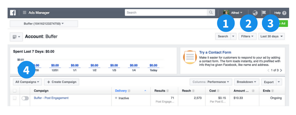 3, Campaign View: Provides information about all your Facebook campaigns once you start running them.