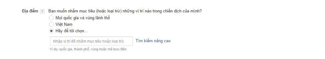 You have 3 options for the location setting: show ads to “All countries and territories,” “Your country” (e.g., Vietnam, the U.S.), or select a location like a city, region, or postal code. If your business expands internationally, you can choose to show ads in other countries where potential customers are concentrated.