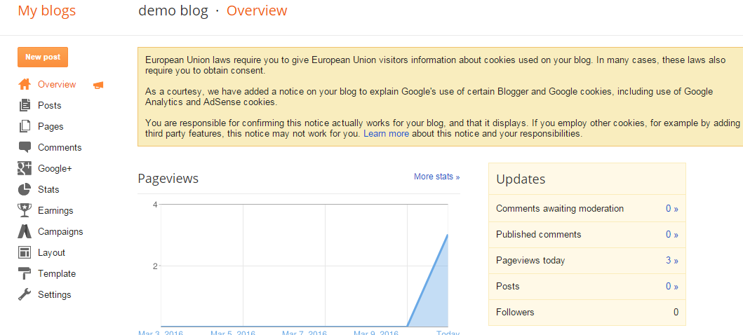 Overview: Contains basic information about views, updates, and Blogger news.