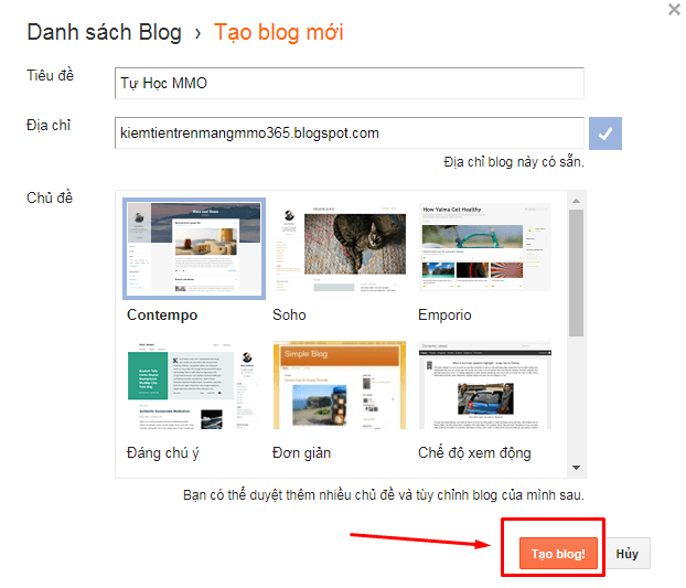 You should create a blog address with a name and title that includes the keywords you want to write about or target. For example, if I want to write about football, I would choose an address like: bongdatintuc.blogspot.com or bongdathethao.blogspot.com.