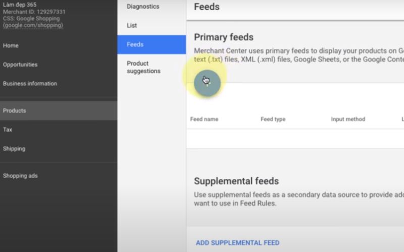 After your Merchant Center account interface loads, you need to set up a data feed for your ad campaign, listing the products in your Shopee store that you want to advertise. Select “Product” on the left navigation bar, then select “Feeds” and click the “+” sign.
