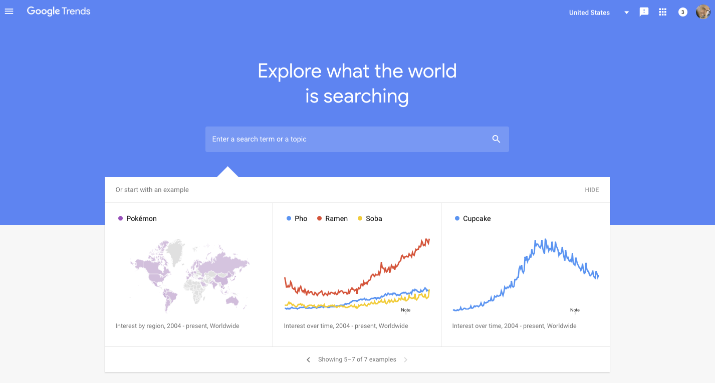 You can input a keyword into the Google Trends search bar to view its search trends by following these steps: