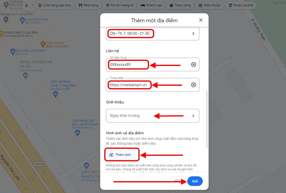 Chọn “Thêm chi tiết khác” để bổ sung các thông tin khác liên quan đến doanh nghiệp như giờ mở cửa, số điện thoại liên hệ, trang web, giới thiệu, hình ảnh về địa điểm,… Trong cách tạo Google Maps, bạn nên thêm ảnh thực tế hoạt động để Google dễ duyệt hơn và bấm “Lưu”.