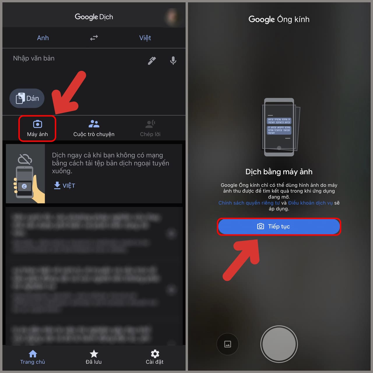 Bước 2: Mở ứng dụng Google Dịch và chọn biểu tượng “Máy ảnh,” sau đó nhấn “Tiếp tục.”