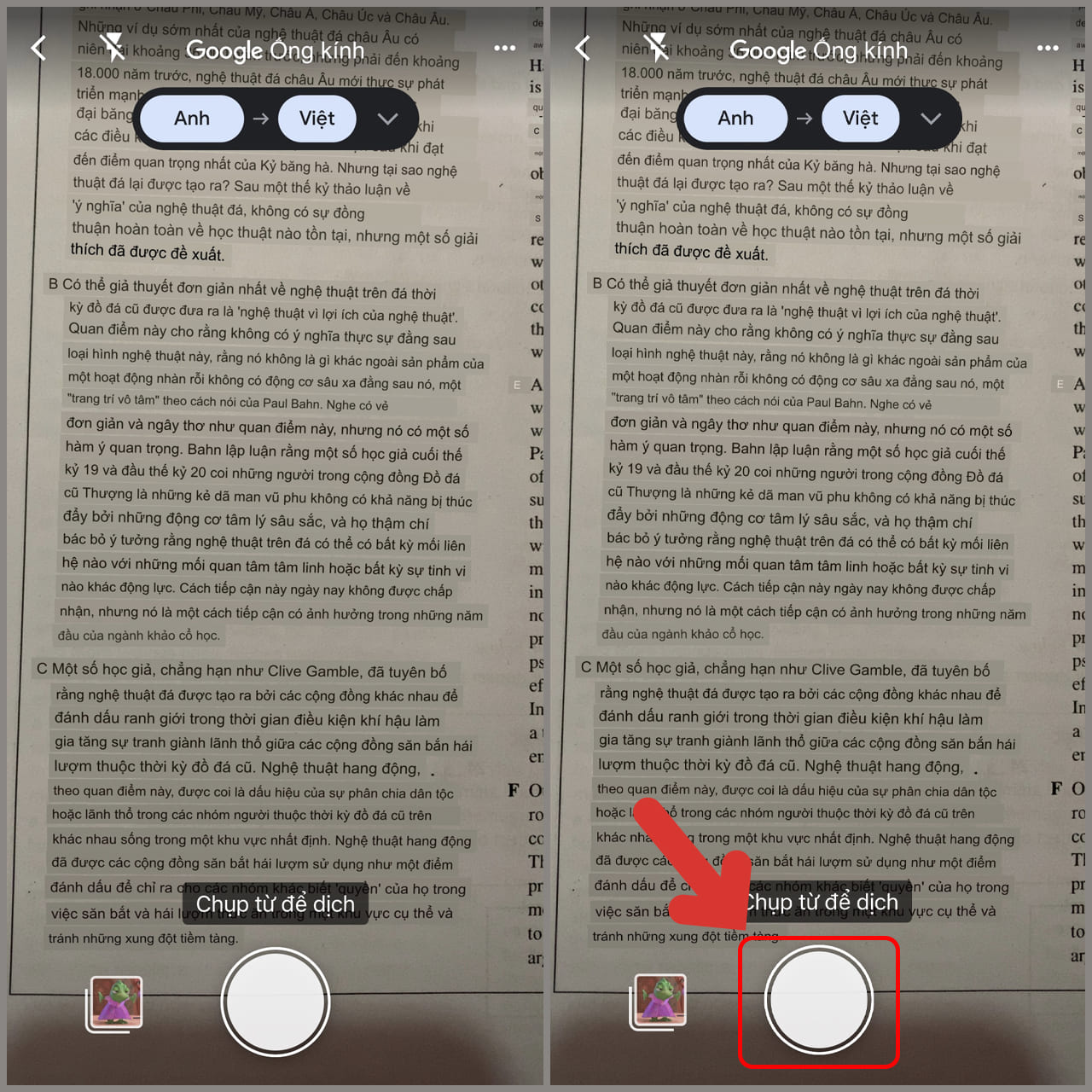 Để dịch văn bản bạn tìm thấy qua máy ảnh: Đưa máy ảnh vào vùng chứa văn bản bạn muốn dịch > sau đó, nhấn vào nút “Chụp” như hình sau.