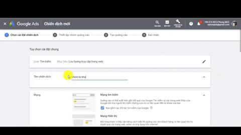 Sau khi đã xây dựng được bộ keyword kèm theo mô tả quảng cáo bây giờ bạn sẽ tiến hành tạo lập chiến dich quảng cáo tìm kiếm cực nhanh và hiệu quả trên Google Ads.
