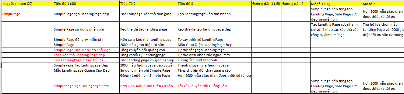 Công việc của bạn lúc này là tạo 1 file excel tạo 7 cột với mỗi cột là 1 mô tả cho quảng cáo như sau