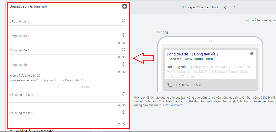 Với mỗi nhóm từ khóa bạn cố gắng tạo ra ít nhất 3 mẫu quảng cáo để khi chạy quảng cáo, Google Ads sẽ tự đo lường và tìm ra mẫu tốt nhất để phân phối.