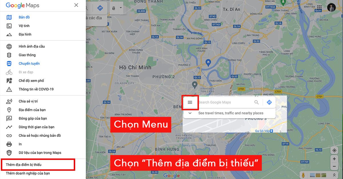 Bước 1: Truy cập vào Google Maps, chọn Menu, chọn “Thêm doanh nghiệp của bạn”