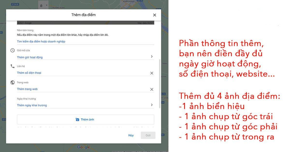 - Phần thông tin thêm, bạn nên điền đầy đủ ngày giờ hoạt động, số điện thoại, website. Sau này, Google có thể sẽ xác minh lại một lần nữa bằng cách gửi mail, nếu bạn không trả lời email thì có thể địa điểm trên Google của bạn sẽ bị đóng.