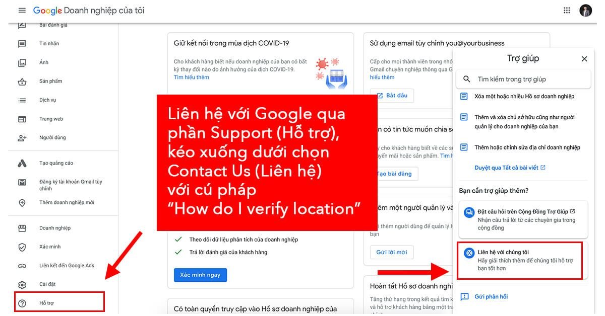 - Nếu không nhận được thư gửi đến, bạn nên thử liên hệ với Google qua phần Support (Hỗ trợ), kéo xuống dưới chọn Contact Us (Liên hệ) với cú pháp “How do I verify location” và làm theo hướng dẫn của đội ngũ Google.