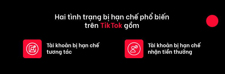 | Phân loại | 2 hình thức hạn chế tài khoản TikTok: – Tài khoản bị hạn chế tương tác; – Tài khoản bị hạn chế nhận tiền thưởng. |