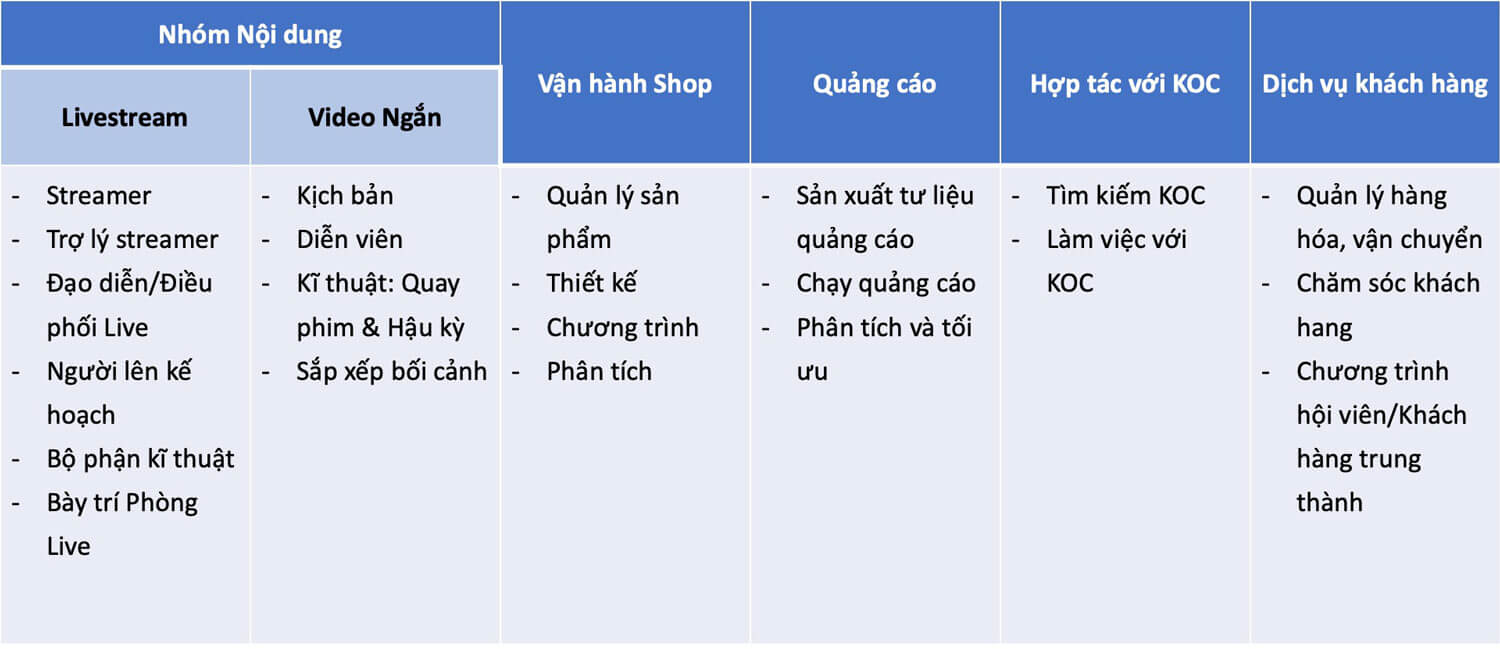 - Quản lý sản phẩm: Chịu trách nhiệm nghiên cứu, lựa chọn, đăng tải và tối ưu sản phẩm. Phân tích và đề xuất sản phẩm chủ lực. Những sản phẩm có khả năng bùng nổ nhất sẽ được sàng lọc, phát sóng trực tiếp và sản xuất các video ngắn kết hợp với các điểm đặc trưng của sản phẩm và các từ ngữ tương ứng.
