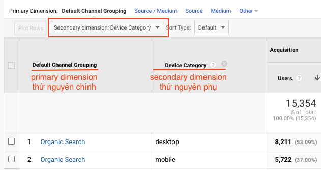 Secondary Dimension mà ban áp dụng cho báo cáo được gọi là một Thứ Nguyên thứ hai. (Bạn có thể hiểu nôm na là thứ nguyên phụ, hỗ trợ bạn thêm nhiều số liệu hơn)