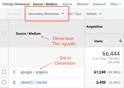 - Ví dụ: ‘Nguồn / Phương tiện‘ là tên thứ nguyên và ‘google / không phải trả tiền‘ là giá trị thứ nguyên.