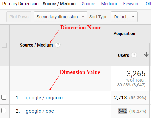 Vì mỗi thứ nguyên bao gồm tên và giá trị, nên ‘Nguồn / Phương tiện‘ là tên thứ nguyên và ‘google / organic‘ và ‘google / cpc‘ là các giá trị thứ nguyên.